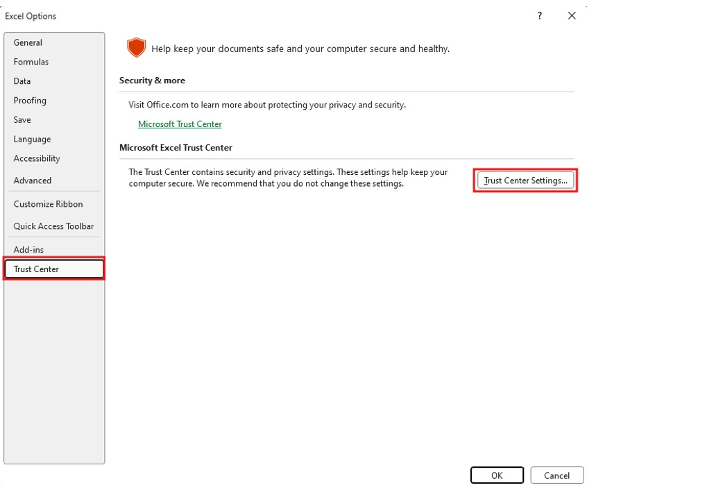 - Click Trust Center Settings