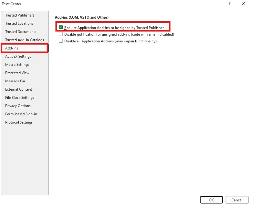 - Check the option labeled “Require application Add-ins to be signed by a trusted publisher”