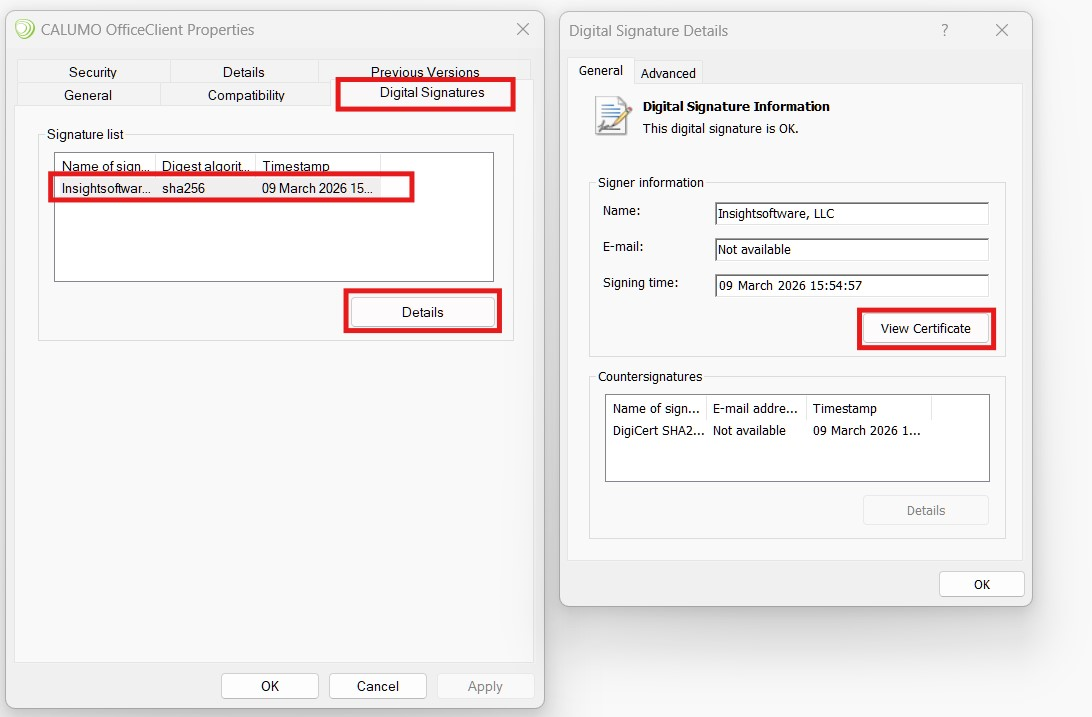 - Right click on OfficeClient.exe > Properties > Digital Signatures >