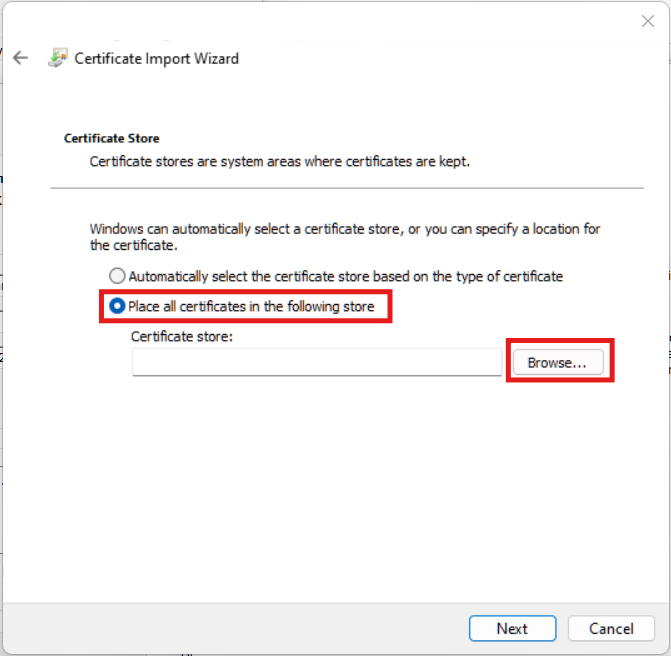 - Choose “Place all certificates in the following store”